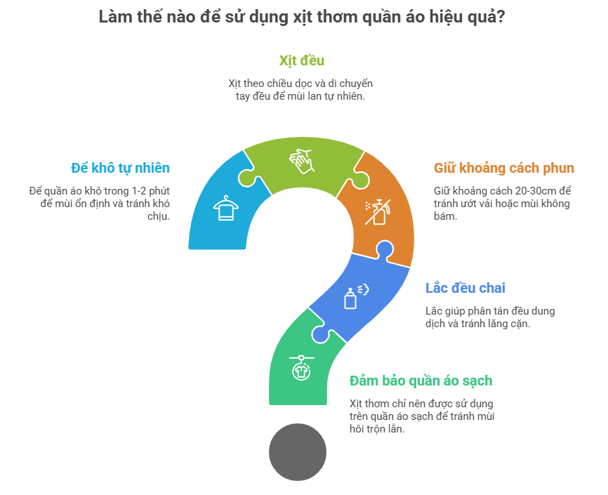 Dưới đây là hướng dẫn chi tiết từng bước giúp bạn sử dụng xịt thơm quần áo hiệu quả nhất.