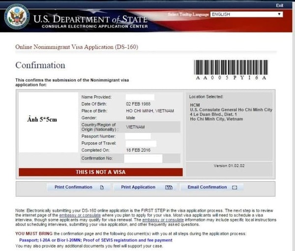 Sau khi hoàn tất, hệ thống sẽ cấp mã xác nhận DS-160. Đây là thông tin bắt buộc để: