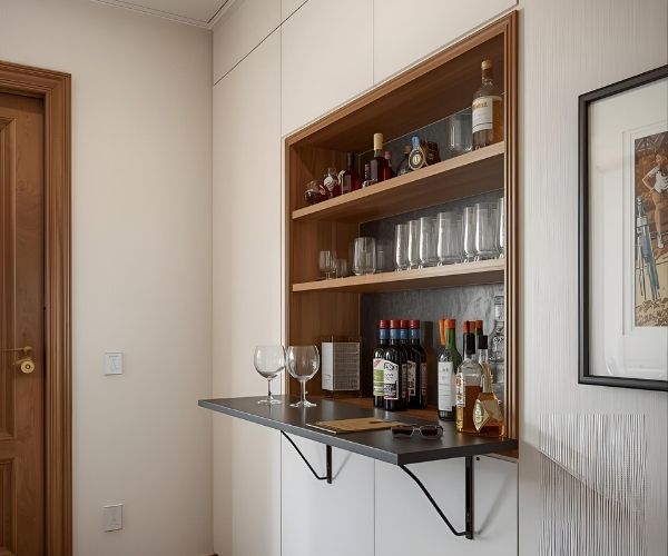 Quầy bar áp tường tiết kiệm diện tích: Với những căn hộ nhỏ, một quầy bar mini gọn gàng gắn sát tường sẽ là giải pháp hợp lý. Bạn có thể thiết kế dạng bàn gập, khi không dùng có thể gấp gọn lại, tạo sự linh hoạt tối đa cho không gian.