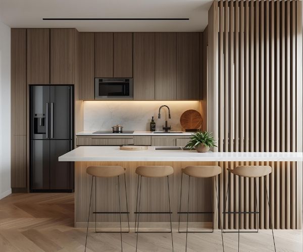 Phối màu hài hòa: Nếu căn hộ theo phong cách hiện đại tối giản, hãy ưu tiên những gam màu trung tính như trắng, xám, be hoặc gỗ tự nhiên để tạo sự sang trọng và dễ kết hợp với nội thất khác. Với những ai yêu thích sự cá tính, bạn có thể thêm các điểm nhấn màu đen, xanh navy hoặc đỏ đô để quầy bar trở thành tâm điểm.