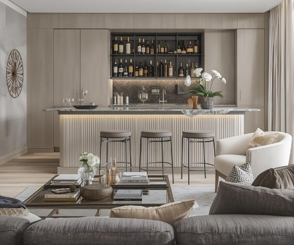 Sự phối hợp khéo léo giữa màu sắc và ánh sáng không chỉ nâng tầm thẩm mỹ mà còn biến quầy bar mini thành “trái tim” của căn hộ – nơi bạn muốn dừng chân và tận hưởng mỗi ngày.
