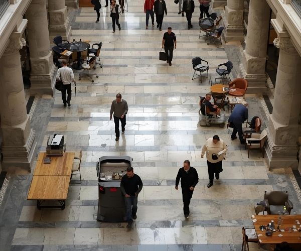 Trong môi trường có mật độ di chuyển cao, sàn đá phải chịu tác động liên tục từ bước chân, bánh xe đẩy hàng, xe vệ sinh, hay việc kéo lê bàn ghế, vật nặng. Mỗi lần ma sát đều tạo ra những vết xước nhỏ li ti trên bề mặt, tuy mắt thường khó thấy nhưng chúng tích tụ dần, khiến lớp bóng tự nhiên bị mài mòn và ánh sáng không thể phản chiếu đồng đều.