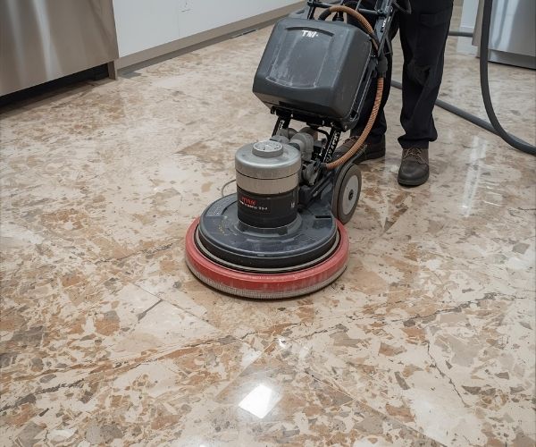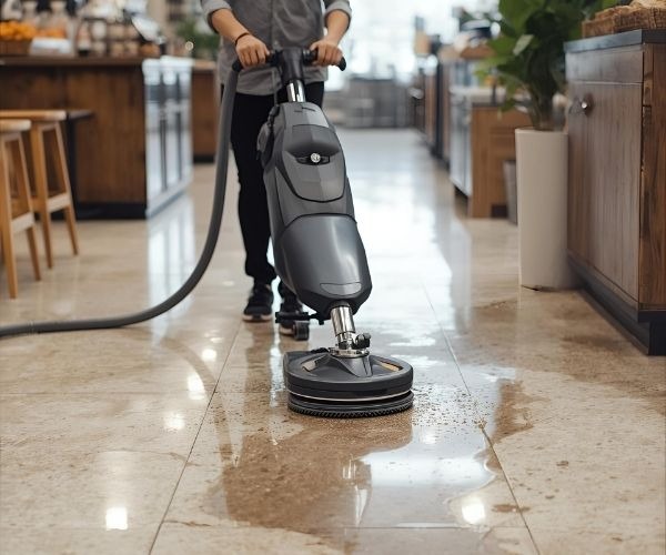 Làm sạch chuyên sâu: Thực hiện các công việc vệ sinh tổng thể như chà sàn, hút bụi thảm, lau kính, làm sáng bóng các bề mặt đá, inox và khu vực kính mặt ngoài nếu cần.