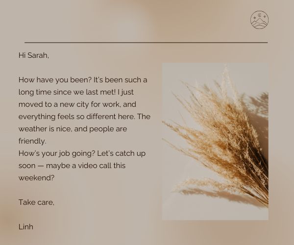 How have you been? It’s been such a long time since we last met! I just moved to a new city for work, and everything feels so different here. The weather is nice, and people are friendly.
